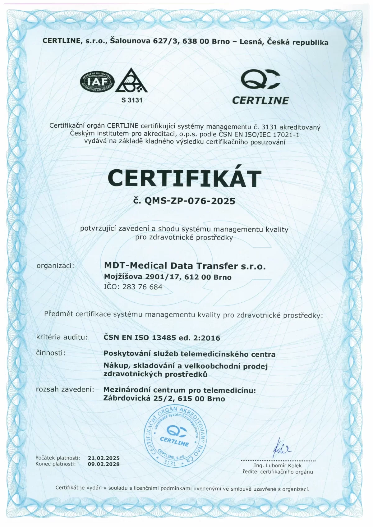 Jsme držitelem certifikátu potvrzujícího zavedení a shodu systému managementu kvality pro zdravotnické prostředky s normou ČSN EN ISO 13485 ed. 2:2016 v oblastech:
